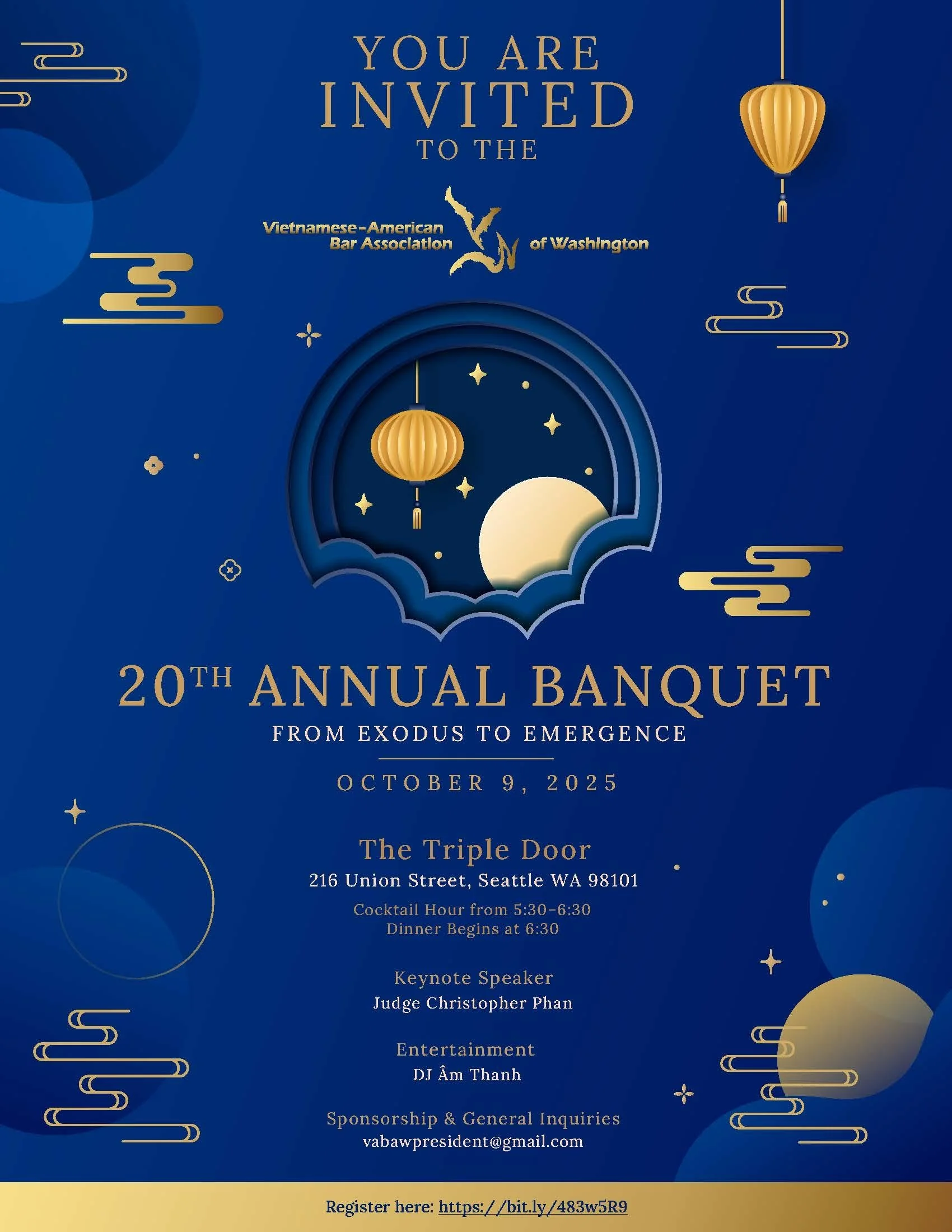 ๐ The Vietnamese American Bar Association of Washington (VABAW) is excited to announce that the 20th Annual Banquet will be on Thursday, October 9, 2025, at The Triple Door in Seattle, WA, and catered by Wild Ginger.